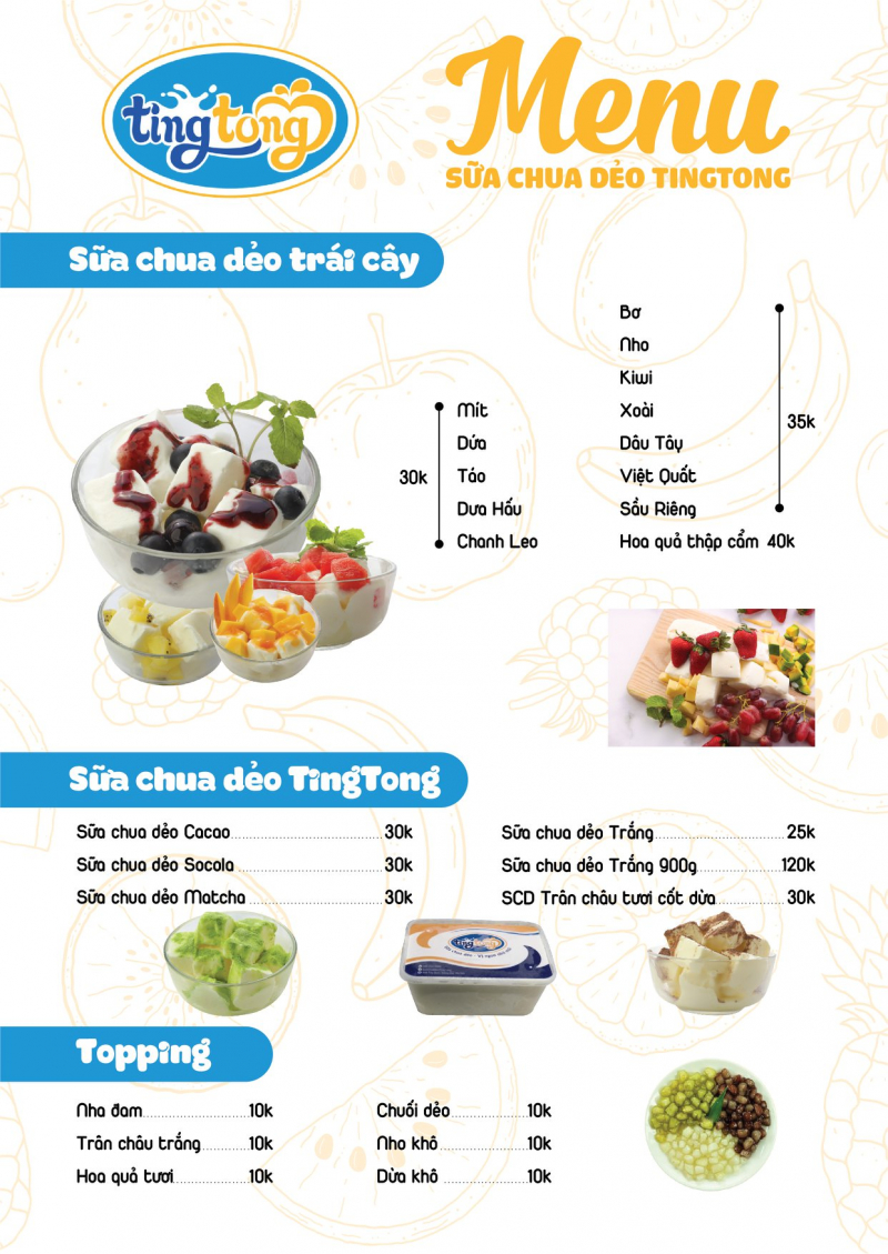 Quán Sữa chua Ting Tong sở hữu menu đa dạng với những hương vị sữa chua đặc sắc như: cacao, socola, matcha, trân châu cốt dừa, trái cây,… trong mức giá dao động từ 25.000 – 35.000 đồng/ cốc. Sữa chua mềm xốp, vị thanh, không quá lạnh thích hợp với mọi thời tiết. Ngoài ra, để phần sữa chua bắt mắt, vui miệng hơn, bạn có thể mix dừa khô, trân châu, nha đam,… Chi nhánh của Tingtong luôn khiến khách hành hài lòng bởi không gian sạch sẽ cùng đội ngũ nhân viên chu đáo, thân thiện.